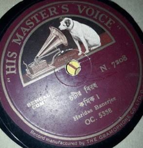 এইচএমভি। মার্চ ১৯৩৪ (ফাল্গুন-চৈত্র ১৩৪০)। নম্বর এন ৭২০৮। শিরোনাম: চটির বিরহ। শিল্পী: হরিদাস বন্দ্যোপাধ্যায়