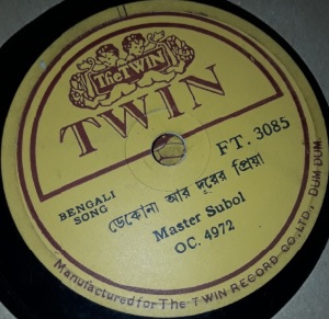 রেকর্ড: টুইন [মার্চ ১৯৩৪ (ফাল্গুন-চৈত্র ১৩৪০)। এফটি ৩০৫৮। শিল্পী: সুবল
