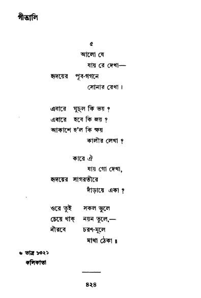 প্রথম সংস্করণ [ইন্ডিয়ান প্রেস, ১৩২১ বঙ্গাব্দ। পঞ্চম গান। পৃষ্ঠা: ৯] [নমুনা]