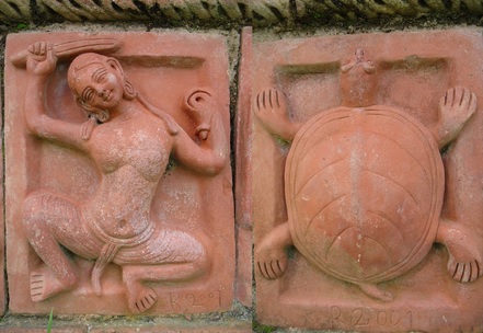 বাইরের আঙিনার দেওয়ালের নিচের দিকে, সারিবদ্ধ টেরাকোটার ফলকগুলো মুগ্ধ করে। নিচে এর