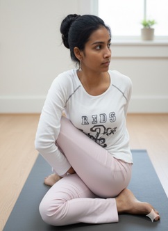২. এবার বাম হাত সোজা করে বাম পাশের পায়েরে উরু অতিক্রম করে স্থাপন করুন। ডান হাত